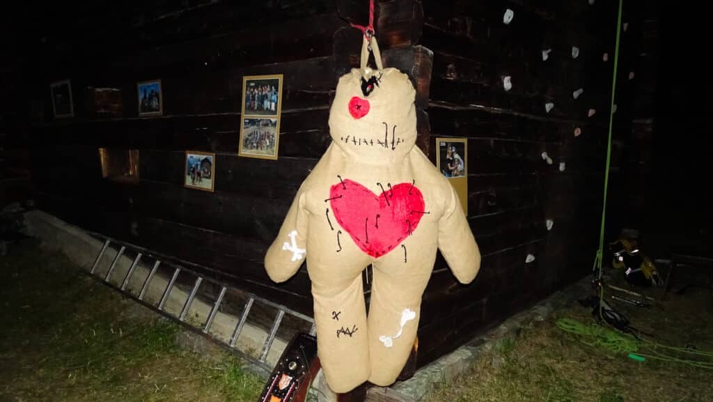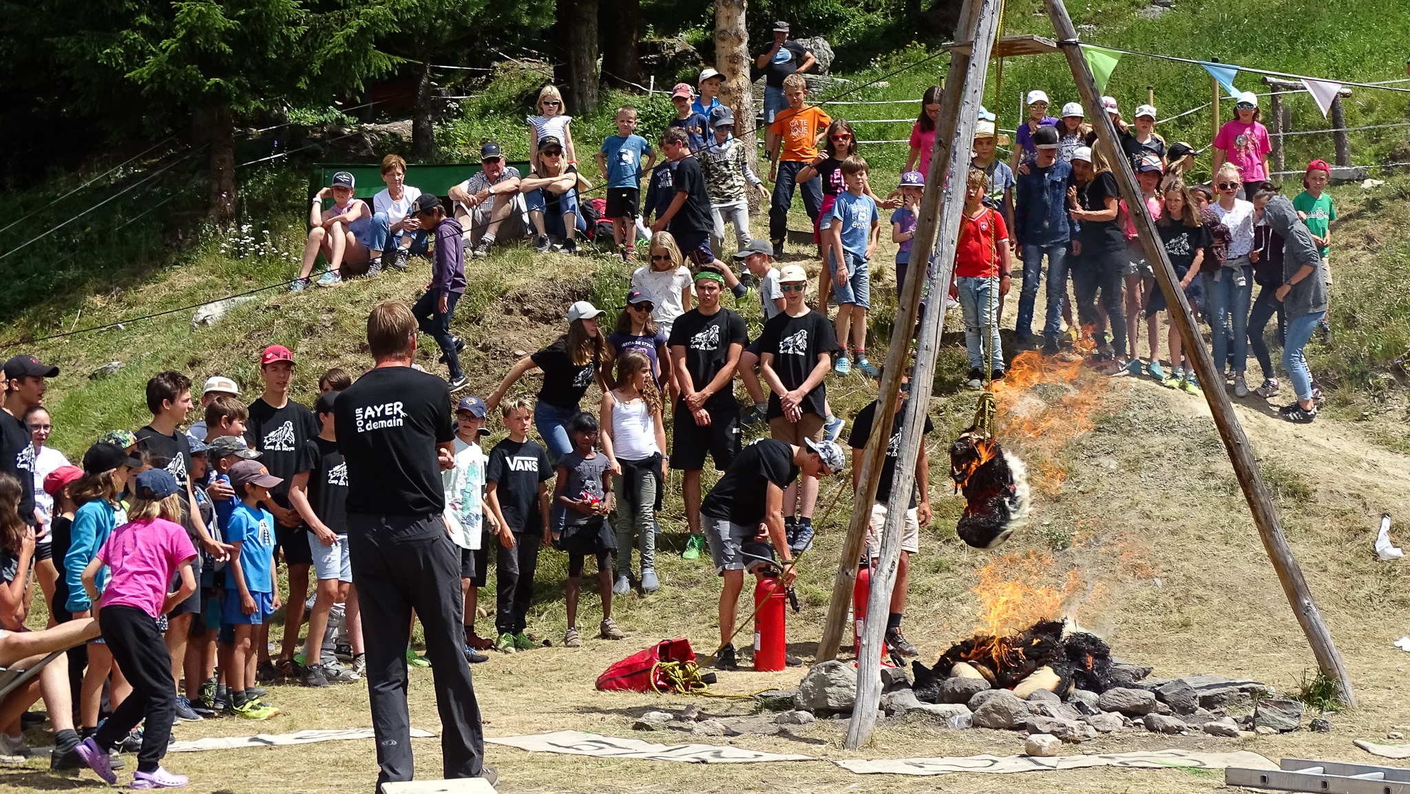 C’est la Moyes’ lédiction, nous jouons avec la chance pendant une semaine et la plupart du temps, nous gagnons. Passer sous les échelles, marcher dans les bouses, faire du vaudou, rien ne nous fait peur. Brändli monte nous fabriquer des hamburgers, nous visitons le centre du monde, et brûlons la poupée vaudou le dernier jour devant les parents alors que l’interdiction de faire du feu entre en vigueur.